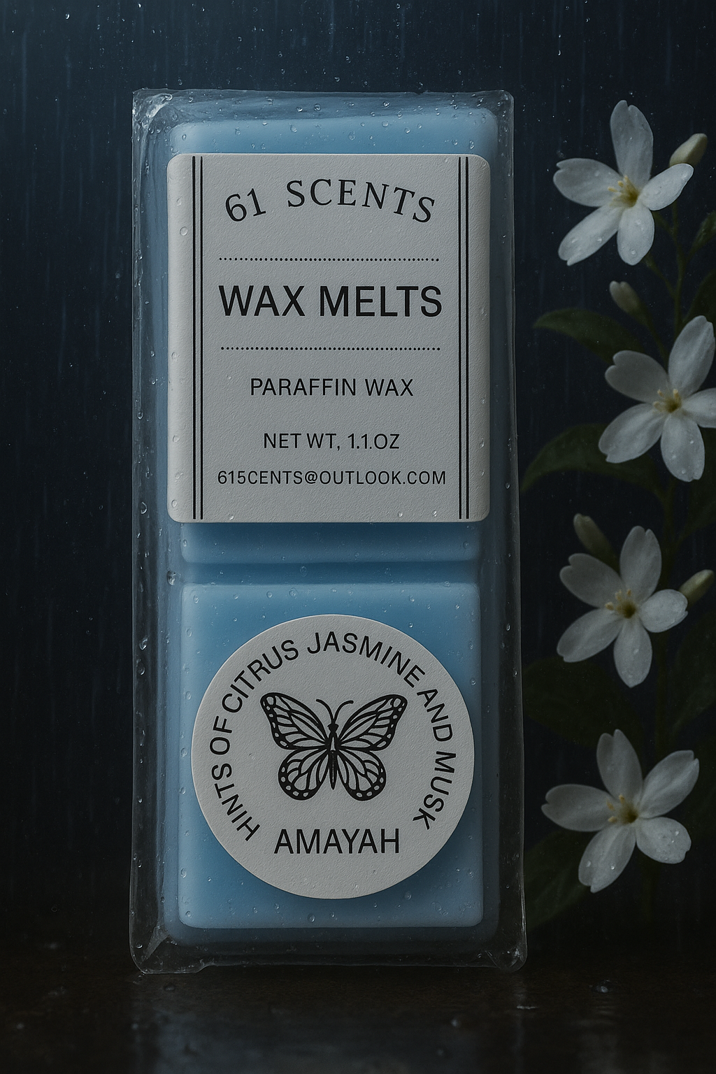 Hand-made highly scented wax snap melts (5 pieces) in square shapes, that will have your space smelling fantastic with hints of Citrus, Jasmine, and Musk.